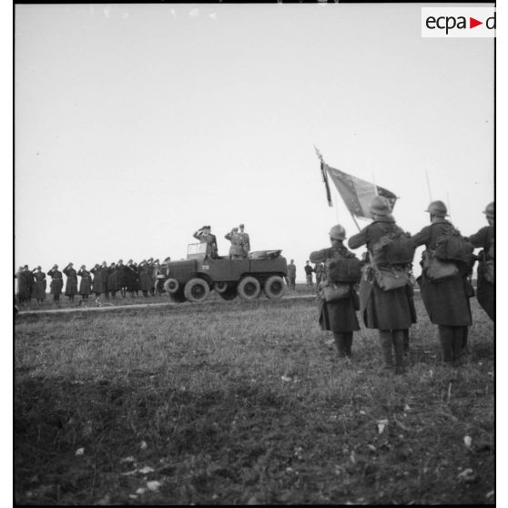 Plan général d'une prise d'armes au sein de la 2e DI : deux généraux à bord d'un Laffly S15 R saluent un drapeau et sa garde.