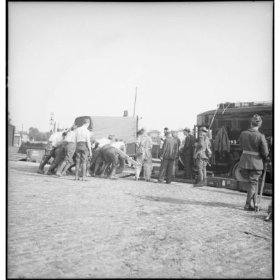 Plan général de soldats qui chargent du matériel sur un wagon ouvert.