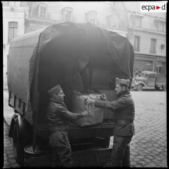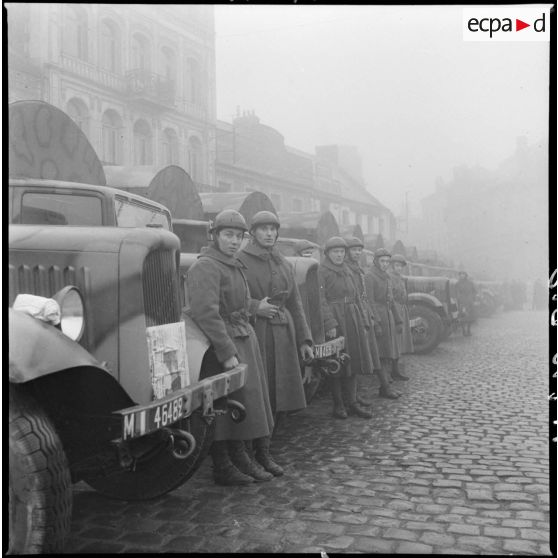 Rassemblement d'une unité du train. Des soldats se tiennent devant des camions Citroën Type 45.