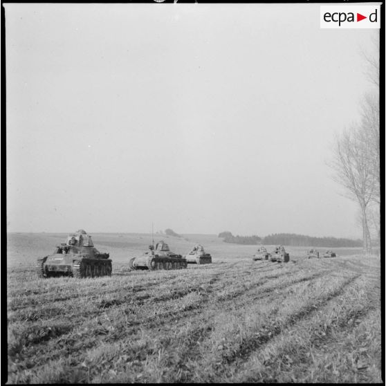Une colonne de chars légers Hotchkiss M35 H du 4e Cuirassiers ou 18e RD est photographiée en plan général de trois quarts arrière alors que les chars progressent sur un terrain plat.