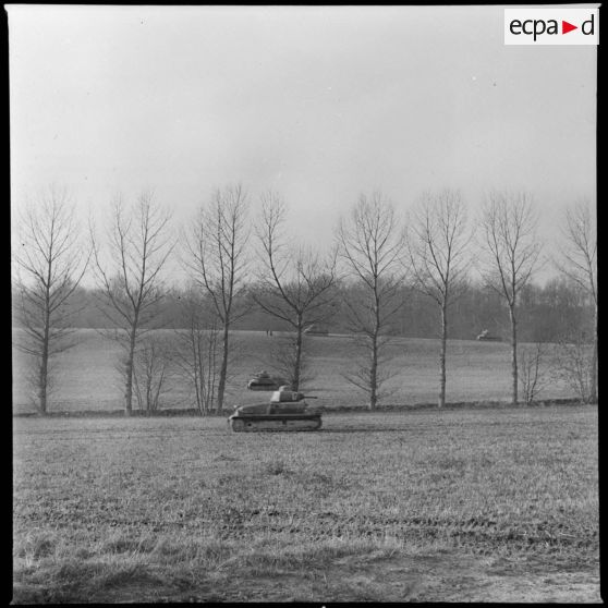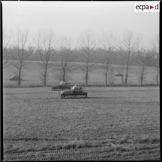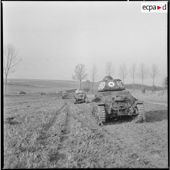 Des AMC Somua S-35 du 4e cuirassiers ou du18e régiment de dragons (RD) progressent en terrain découvert.