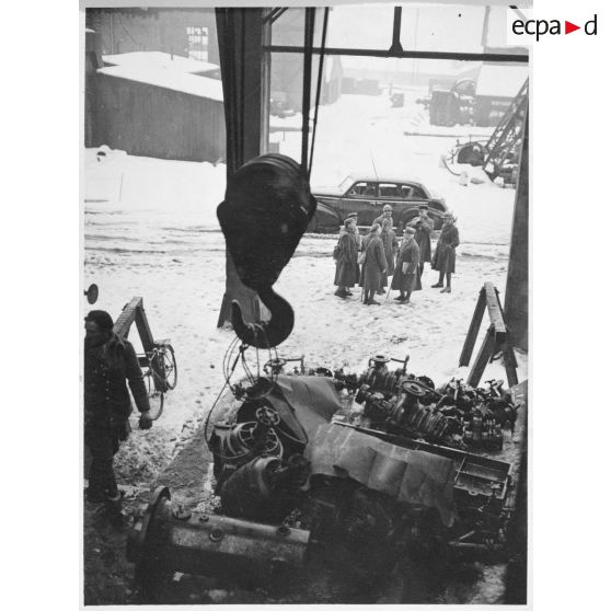 Le général d'armée Réquin s'entretient avec des officiers lors de la visite d'une installation industrielle.