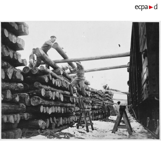 Des soldats de la 4e armée chargent des rondins de bois dans des wagons.