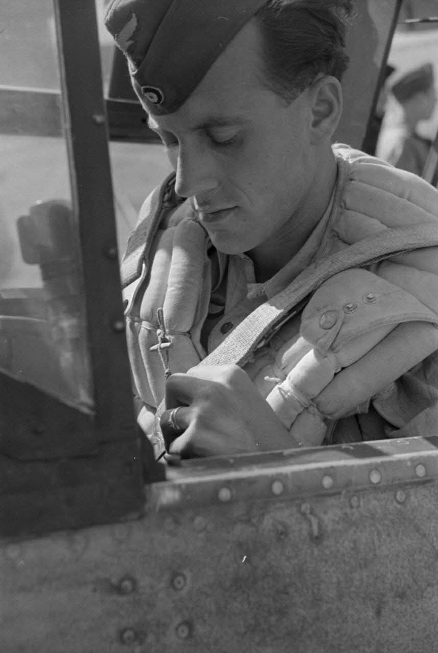 Plan serré sur un pilote allemand aux commandes d'un chasseur Messerschmitt, verrière ouverte.