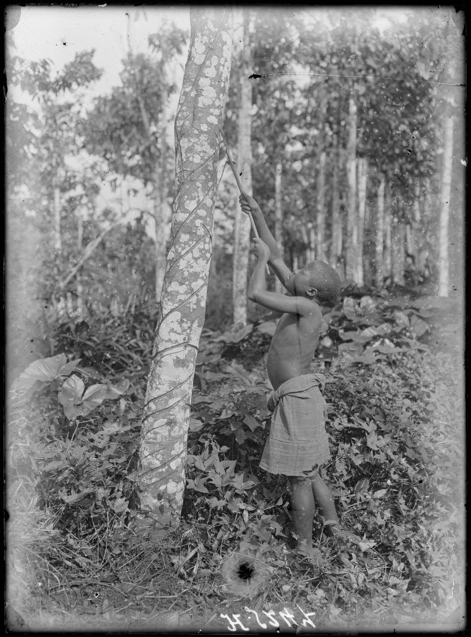 Plantation de l'Hermannshof. La saignée d'un arbre. La latex coule.