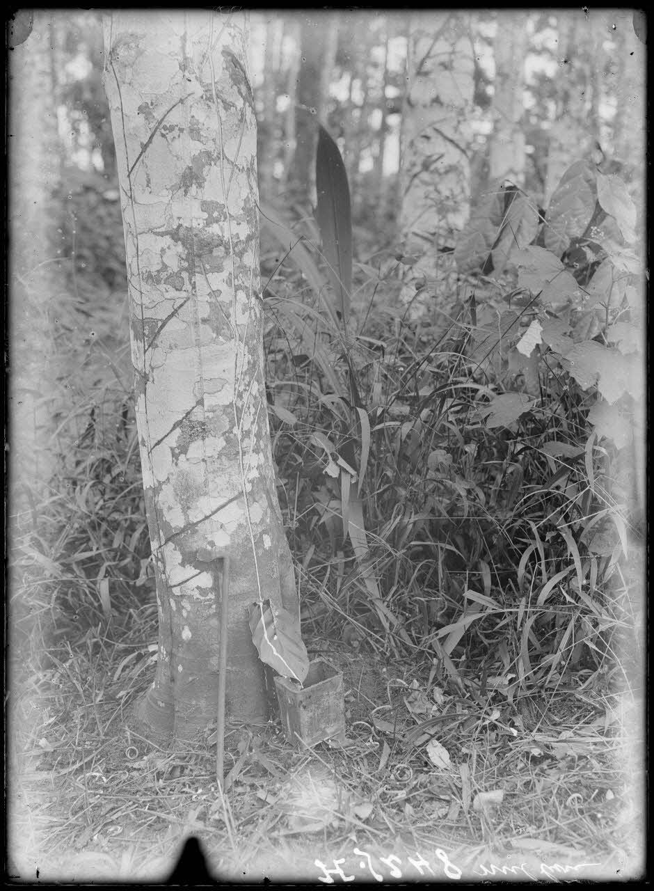 Plantation de l'Hermannshof. La saignée d'un arbre. La latex coule. [légende d'origine]