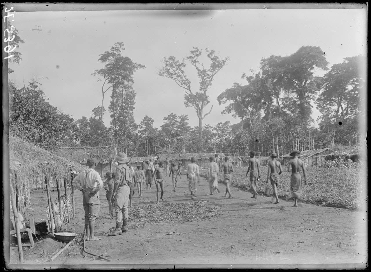 Plantation de l'Hermannshof. Hommes apportant le latex récolté.
