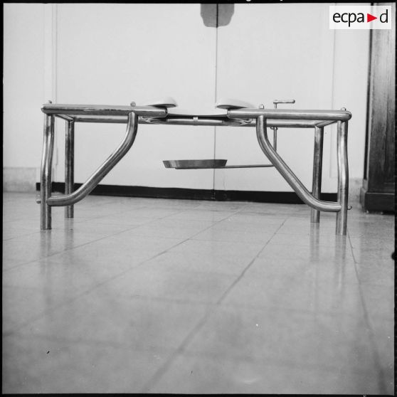 Tirages recadrés d'un WC mobile à l'hôpital Maillot. Il permet de recueillir les excréments du patient.