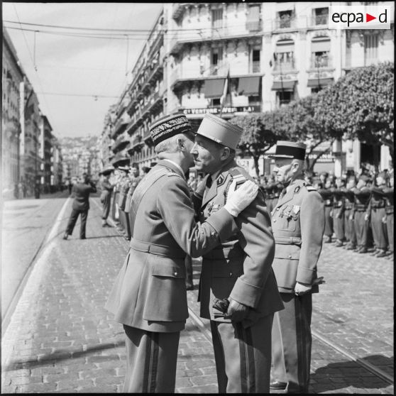 Remise d'une décoration par le général de corps d'armée Cailles lors des commémorations du 8 mai au Plateau des Glières à Alger.