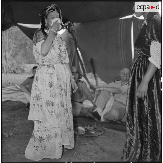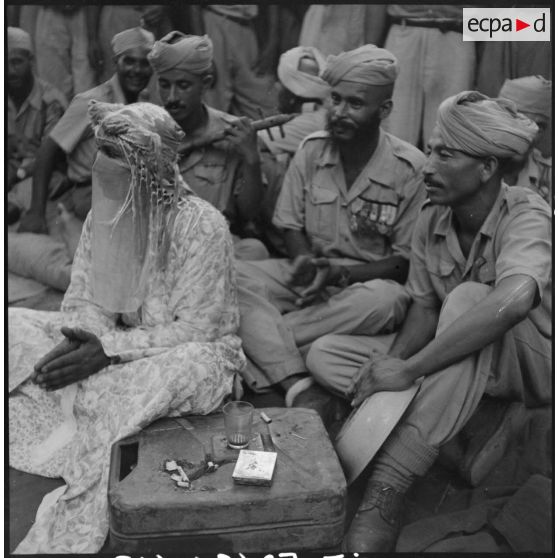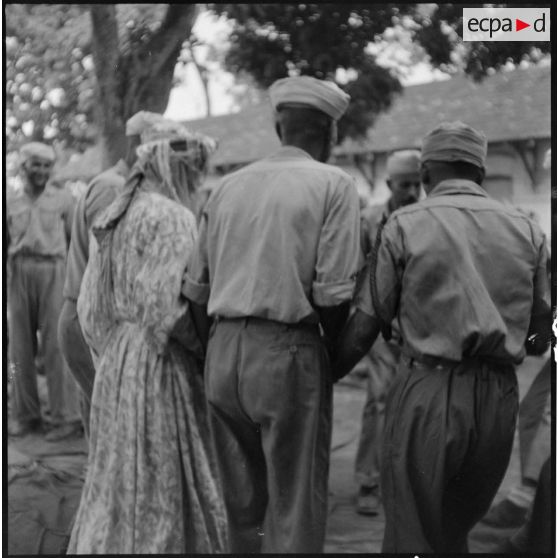 Danseuse Cheikhat en tenue traditionnelle des Aurès aux côtés de goumiers marocains lors de la fête de l'Aïd el-Seghir à Lang Son.