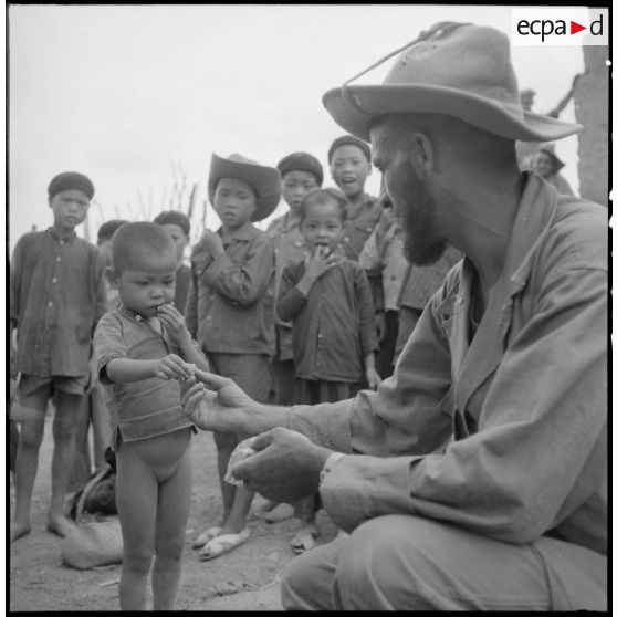Le sergent Bonazza du 59e Goum donne un bonbon à un enfant vietnamien.