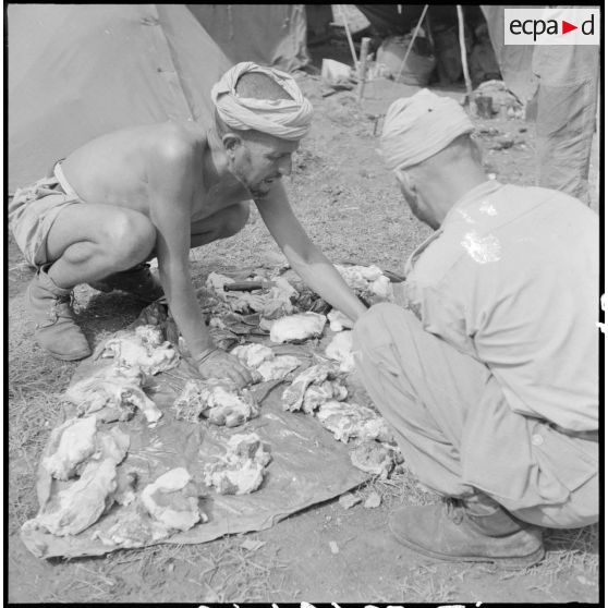 Découpage de la viande et partage des morceaux entre les goumiers marocains lors de l'Aïd el-Seghir à Lang Son.