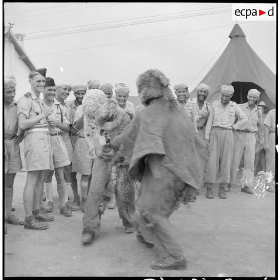 Danse rituelle exécutée par deux goumiers marocains couverts d'une peau de mouton lors de la fête de l'Aïd el-Seghir à Long Son.