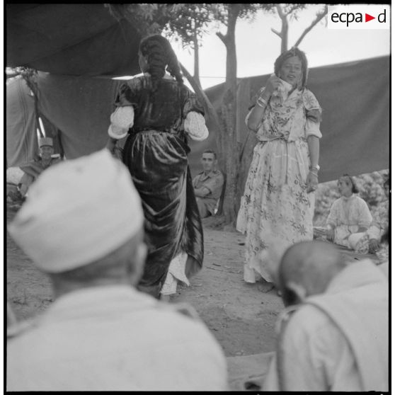 Danseuses Cheikhat en costume des Aurès dansant pour les goumiers marocains lors de la fête de l'Aïd el-Seghir à Lang Son.