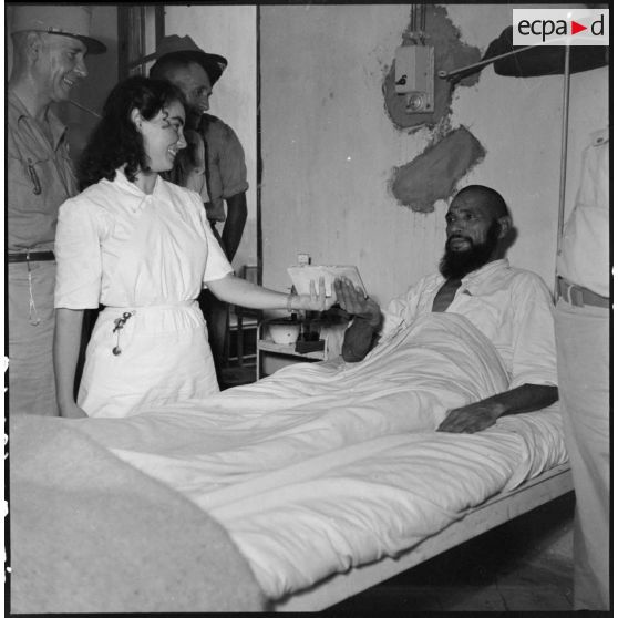 Le lieutenant-colonel Le Page, commandant le GTMEO (Groupement de tabors marocains en Extrême-Orient), rend visite à un goumier blessé et soigné à l' hôpital de Lang Son.