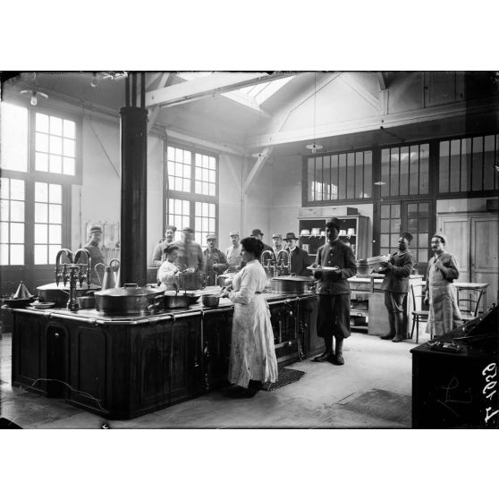 -les cuisines et le réfectoire de l'hôpital temporaire musulman Villemain sont photographiés pendant le déjeuner des malades, lors de la visite de monsieur Dobler ;
