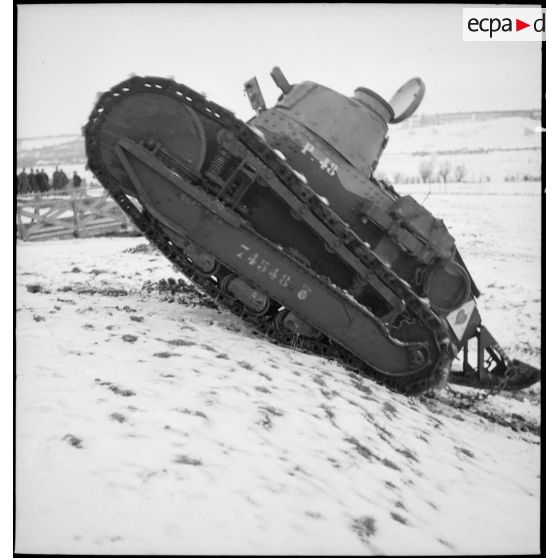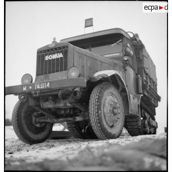 Plan rapproché d'un tracteur lourd de dépanage de chars de type Somua MCL 5 sur une route de campagne enneigée.