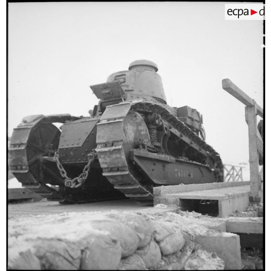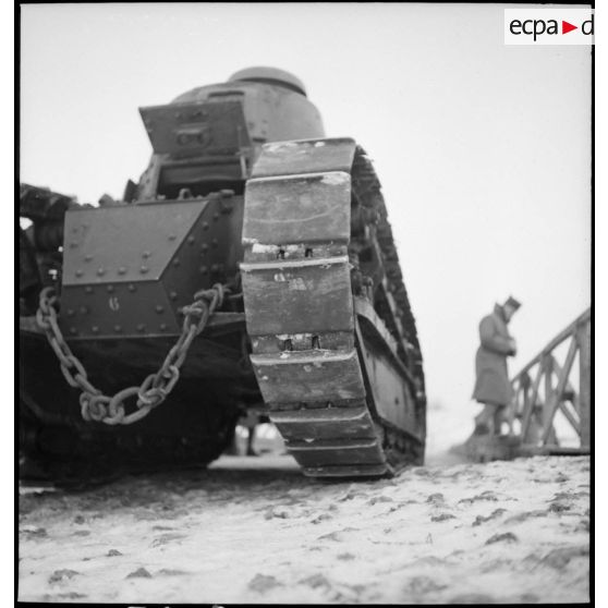 Char Renault FT 17 traversant un pont en bois récemment construit.