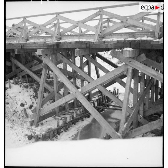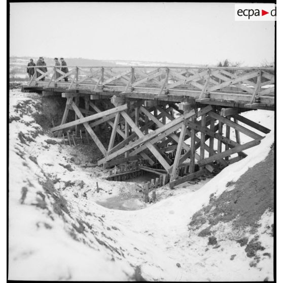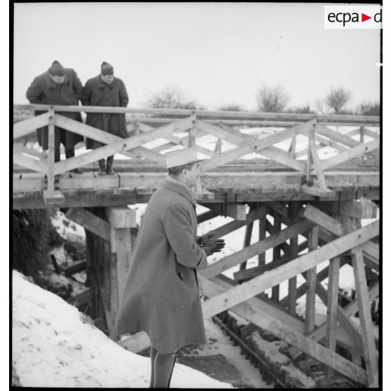 Colonel détaché de l'état-major et général de corps d'armée sur un pont en bois récemment construit dans le secteur de la 9e armée.