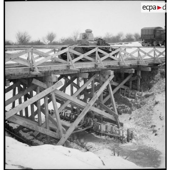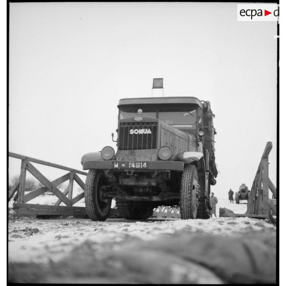 Tracteur lourd de dépannage de chars de type Somua MCL 5, traversant un pont en bois contruit récemment sur le front de la 9e armée.