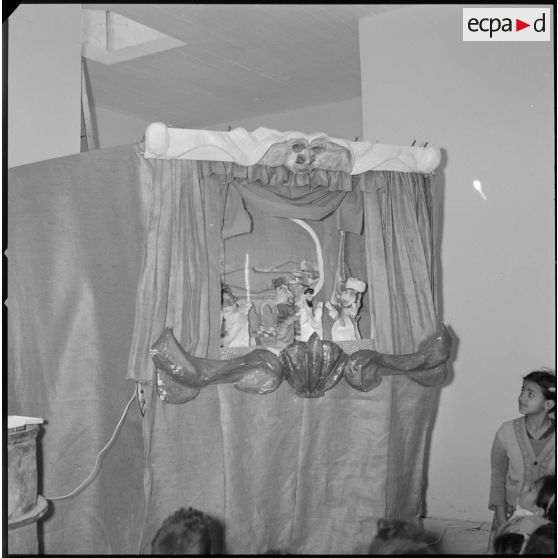 Un spectacle de marionnettes est organisé et animé par les appelés du 8e RIM. Les hommes, les femmes et les enfants du camp de regroupement assistent au spectacle..