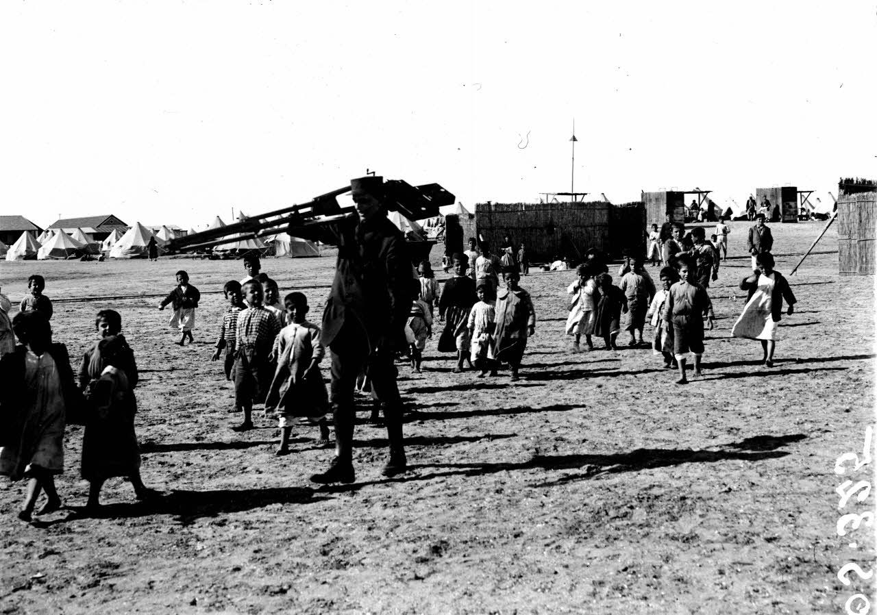 Port-Saïd. Camp de réfugiés arméniens. Les enfants suivent l'opérateur de la SPCA. [légende d'origine]