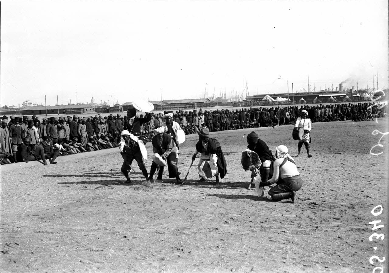 Port-Saïd. Fête au camp de tirailleurs malgaches. Danse guerrière des Grandes Comores. [légende d'origine]