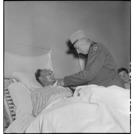 A l'hôpital de Lanessan, un légionnaire 2e classe du I/5e REI (régiment étranger d’infanterie) serre la main du général de Linarès venu remettre des décorations aux soldats blessés.