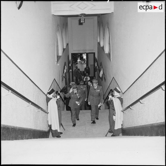 Arrivée du général de Monsabert en bas de l'escalier de la salle de la Libération au cercle des officiers d'Alger.