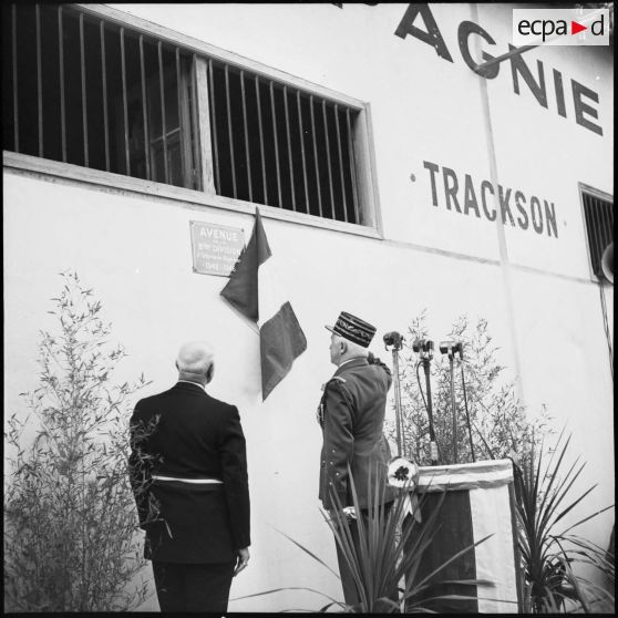 Le général de Monsabert innaugure la plaque de l'avenue de la 3e DIA (division d'infanterie algérienne) à Alger.