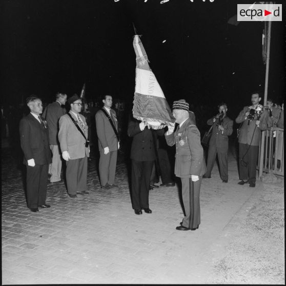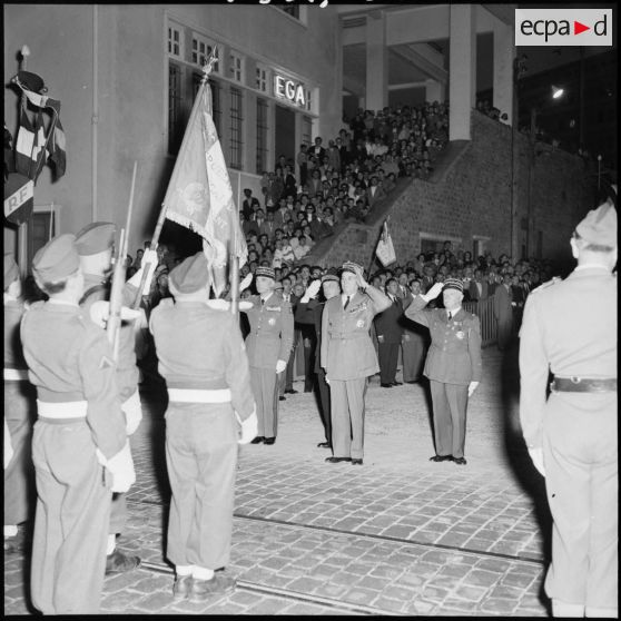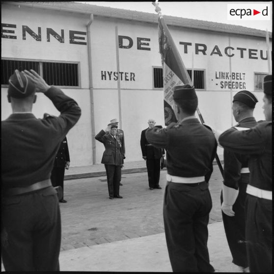 Le général de Monsabert devant les porte-drapeaux lors de l'inauguration de l'avenue de la 3e DIA à Alger.