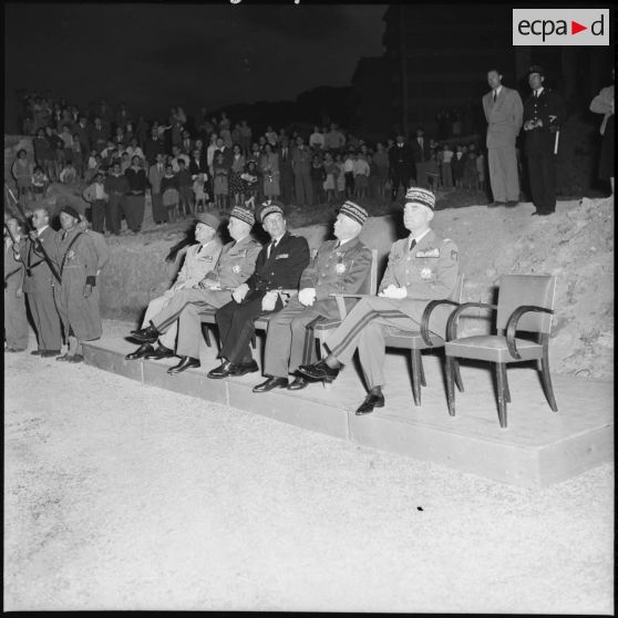 La tribune officielle avec le général de Monsabert lors de l'inauguration de l'avenue de la 3e DIA à Alger.