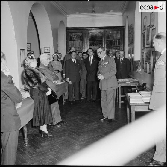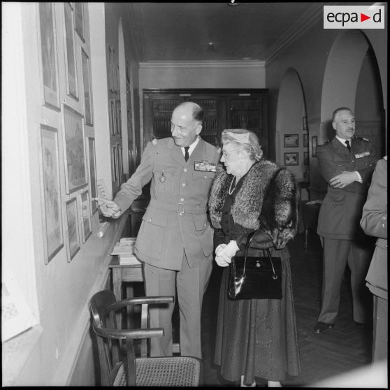 La femme du général de Monsabert visite l'exposition de tableaux de Roger Jouanneau Irriera au cercle des officiers d'Alger.