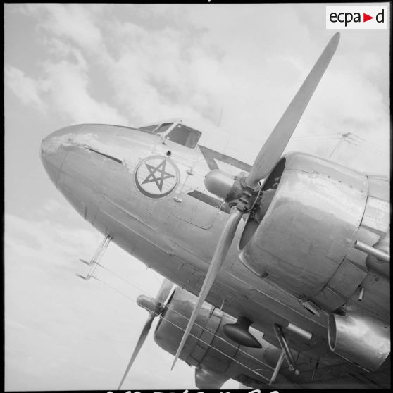 Vue rapprochée de la partie avant du DC 3 d' Atlas Air Maroc dans lequel voyageaient les chefs du FLN.