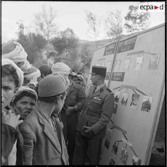 Un capitaine légionnaire présente des panneaux photographiques aux habitants de Gallieni dans le cadre de l'action psychologique.