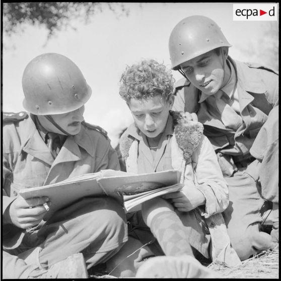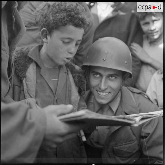 Moment de lecture du livre "La France et l'Union française" pour un enfant de Gallieni et des appelés du contingent de la CHPT.