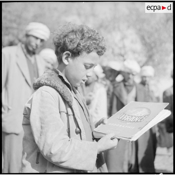 Un enfant de Gallieni lit un passage du livre "La France et l'Union française" à des appelés du contingent de la CHPT.