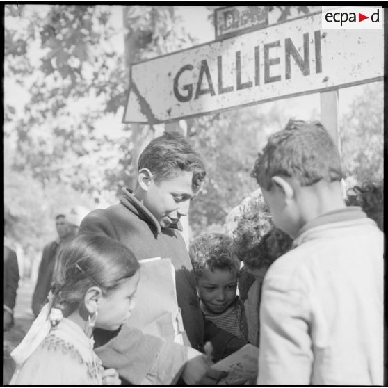 Des enfants de Gallieni découvrent les livres et journaux distribués par les officiers de la CHPT.