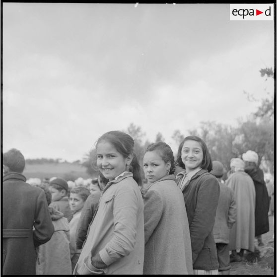 Trois écolières du village de Gallieni lors du discours de la compagnie de haut-parleurs et de tracts.