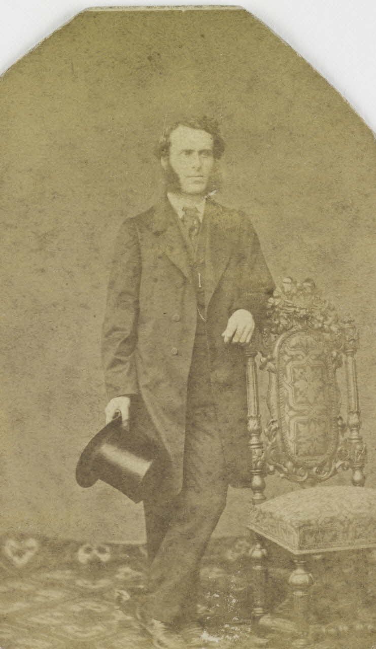 [Portrait d'un homme avec de larges favoris et tenant un chapeau haut de forme à la main].