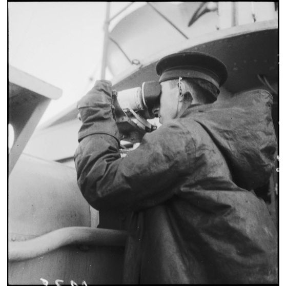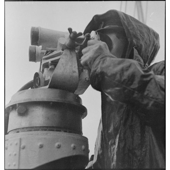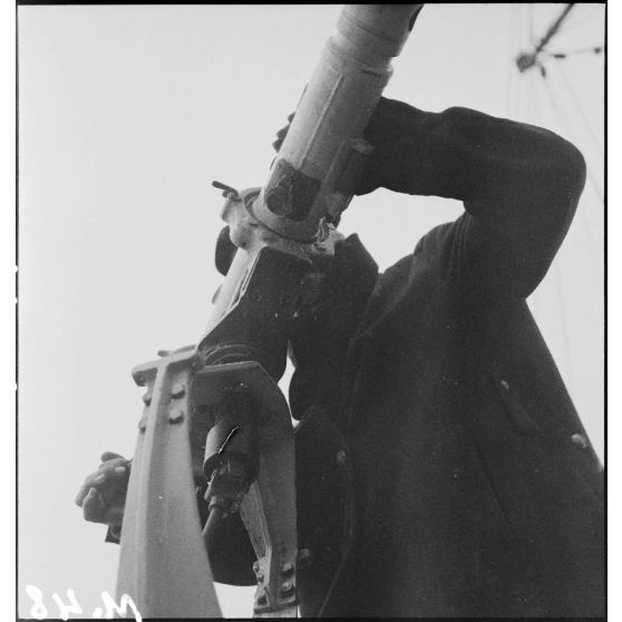 Un télépointeur à bord du contre-torpilleur Le Malin utilise un télémètre pour déterminer la distance d'un objectif.