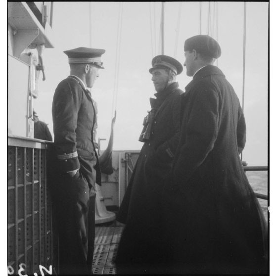 Officiers et aumônier en discussion sur la passerelle du contre-torpilleur Le Malin. A gauche, le lieutenant de vaisseau Jean Cornuault.