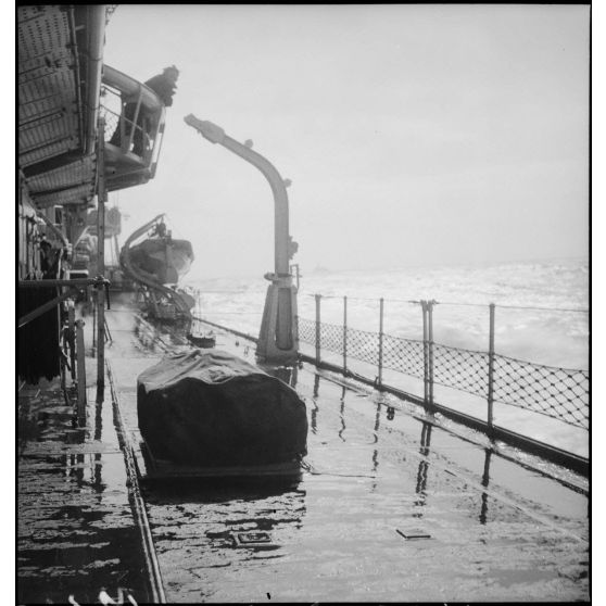 Vue du pont du contre-torpilleur Le Malin en haute mer.
