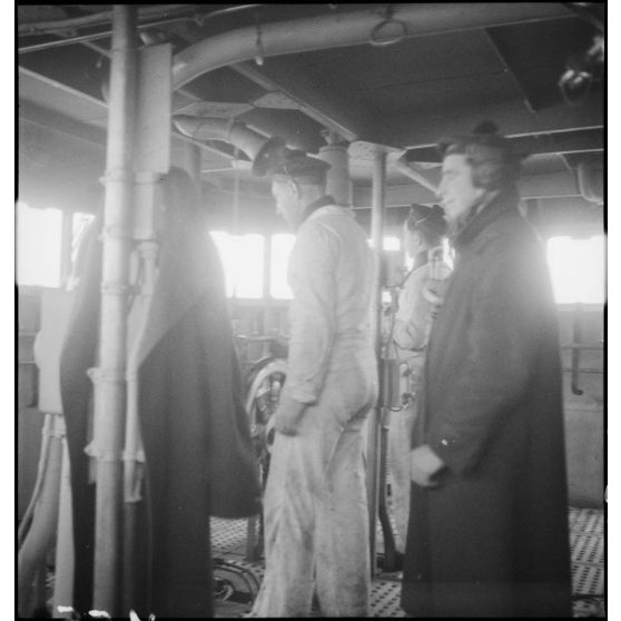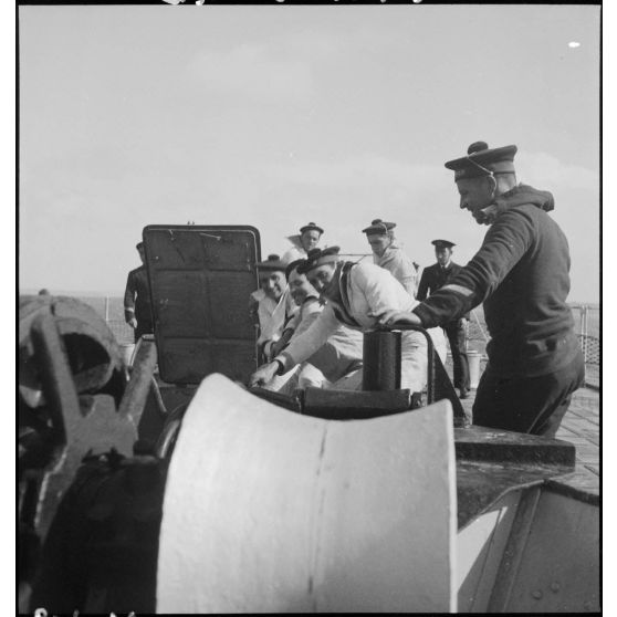 Membres d'équipage à leur poste au blockhaus du contre-torpilleur Le Malin.