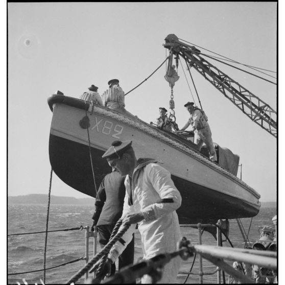Mise à l'eau d'une embarcation légère du contre-torpilleur Le Malin.