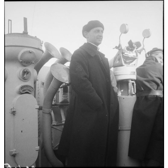 Portrait en pied de l'aumônier du contre-torpilleur Le Malin sur le pont du navire.