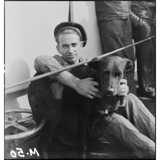 Le chien Dixmude, mascotte du contre-torpilleur Le Malin.