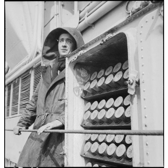 Portrait d'un marin canonnier de guet à bord du contre-torpilleur Le Malin.