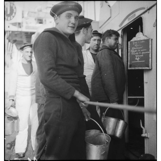 Matelots au ravitaillement à l'entrée des cuisines du contre-torpilleur Le Malin.
