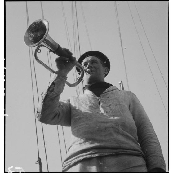 Portrait en contre-plongée du clairon à bord du contre-torpilleur Le Malin.